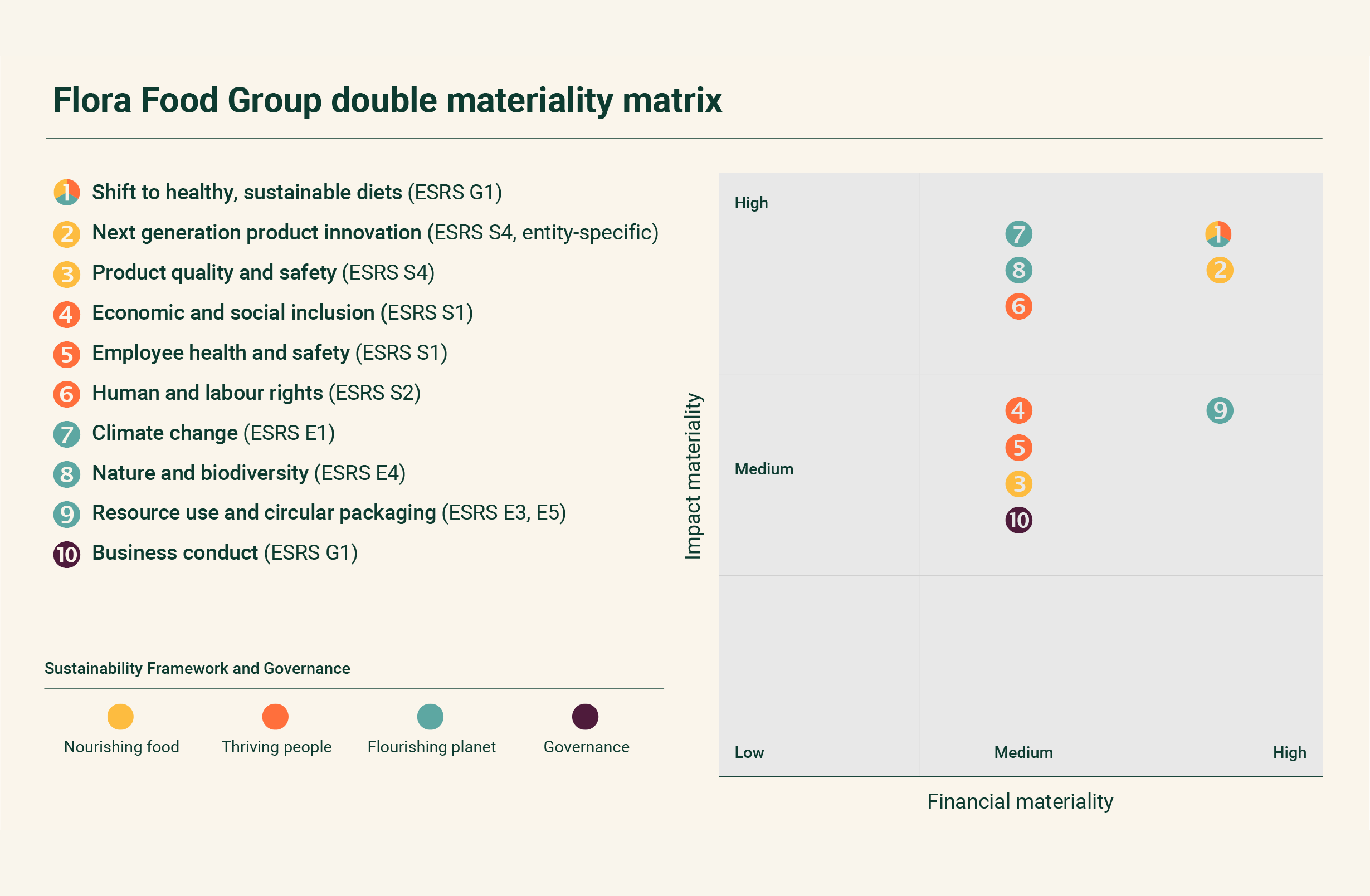 We take a materiality-led approach to our sustainability ambitions. Our Sustainability Framework was created by understanding what really matters to our customers, wider stakeholders and business.’ In 2024, we finalised the latest revision of our DMA. It builds on our 2020 assessment and a detailed analysis conducted in 2023, with input of key internal and external stakeholders. Our updated materiality assessment shows where we can have the greatest impact and is reflected in our Sustainability Framework. Our materiality matrix shows the relationship between the material topics and the three pillars of our Sustainability Framework.